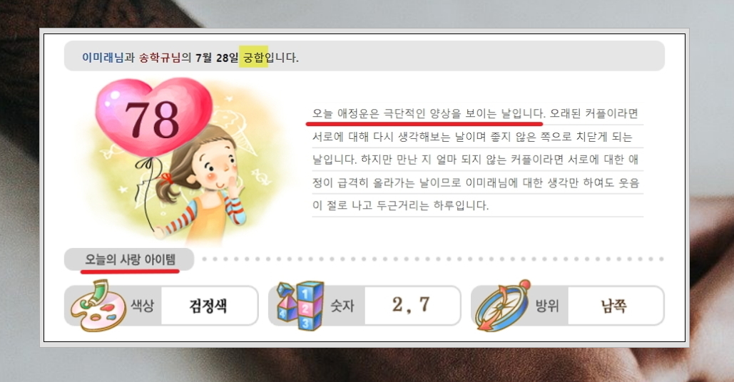 6. 생년월일로 살펴본 궁합 풀이가 나왔습니다. 간단하게 우리 관계를 볼 수 있는 점수, 상세한 풀이, 오늘의 사랑 아이템 이렇게 3가지 영역으로 구성되어 있는데요. 풀이를 보니 오늘은 상대방과의 관계에 있어서 조심해야 한다고 합니다. 이럴 때에는 상대보다 더 배려심과 인내심을 갖고 대처하는 것이 관계 유지에 도움이 되겠네요.