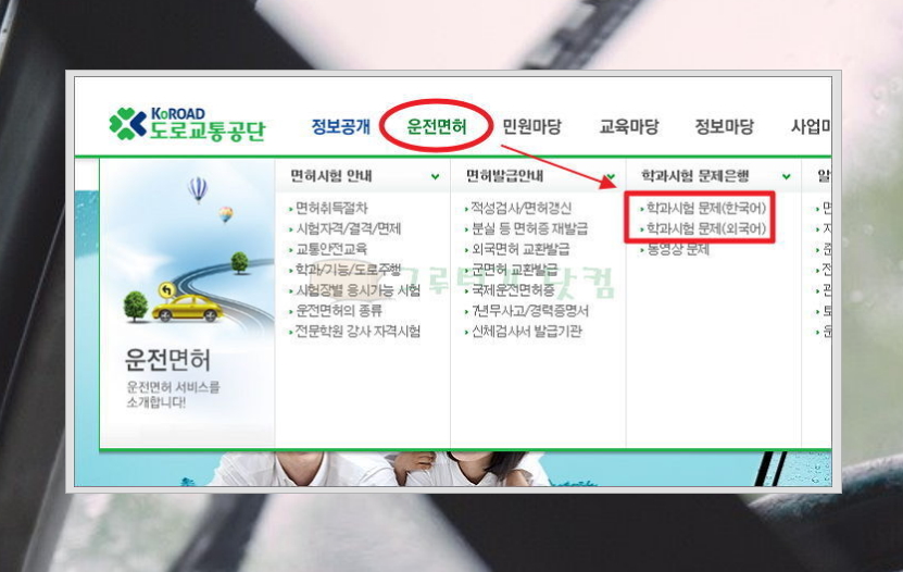도로교통공단 홈페이지에서는 운전에 대한 다양한 민원업무를 처리할 수 있고, 운전면허 필기시험문제와 같은 자료를 얻을 수도 있습니다. 메뉴에 있는 운전면허를 클릭한 후 '필기시험 문제(한국어)'를 클릭해주세요. 외국어가 익숙하신 분들을 위해 외국어 버전도 마련되어 있습니다.