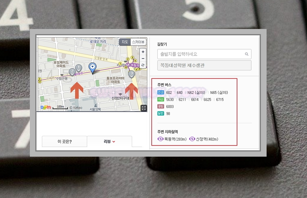 전화번호로 찾은 주소에서 상세보기를 눌러보세요. 그럼 해당 위치에 대한 소개와 리뷰 뿐만 아니라 주변 버스와 지하철역에 대한 번호와 위치를 확인할 수 있습니다. 전화번호만 알면 이렇게 길찾기까지 할 수 있어요.
