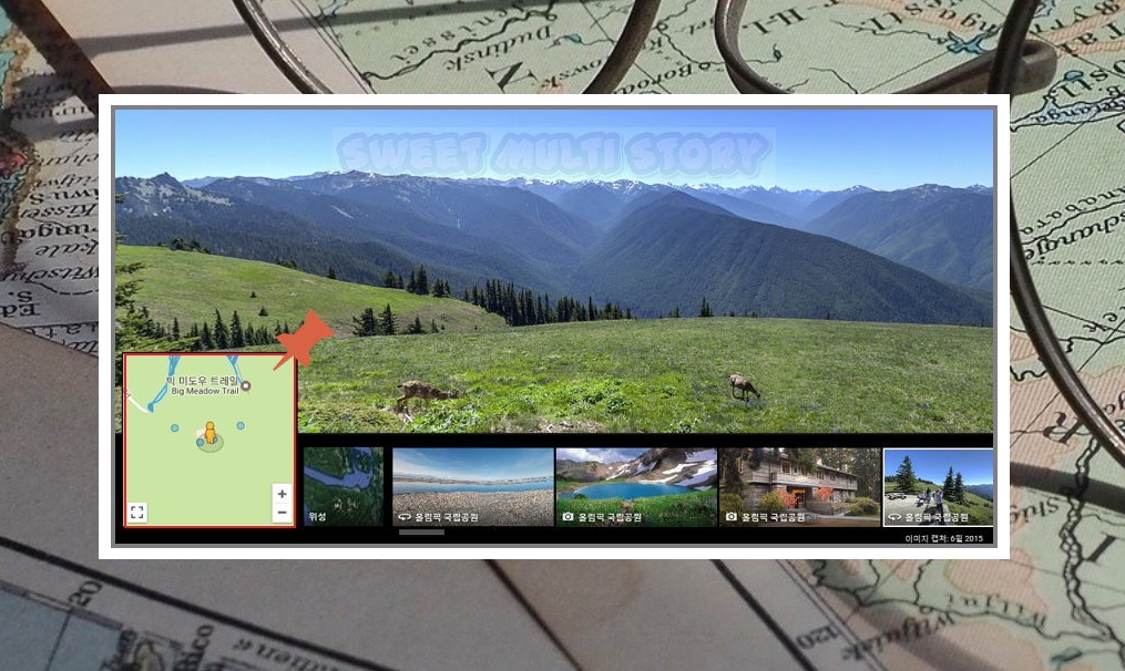 우측에 보이는 지도에서 자세히 보고 싶은 곳을 더블 클릭하면 되는데요. 미국 워싱턴에 있는 올림픽 국립공원에 대한 정보를 살펴보겠습니다. 단순히 클릭 한 번이면 알 수 있는데요. 좌측에 있는 이미지를 누르면 360도로 볼 수 있는 스트리트 뷰를 이용할 수 있습니다.