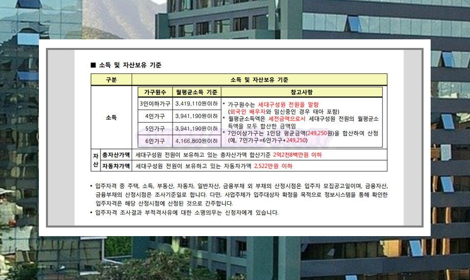 신청자격 항목을 보시면 해당 공고에 대한 입주조건을 자세하게 살펴보실 수 있습니다. 보통 소득, 부동산, 자동차을 따져보아야 해요.