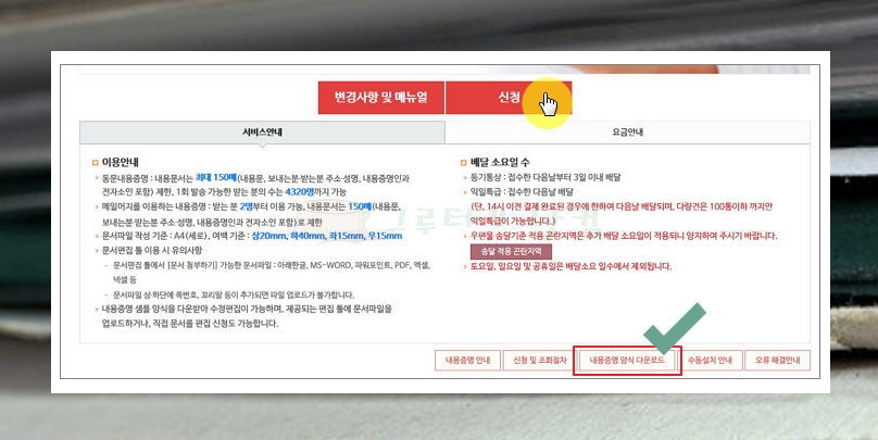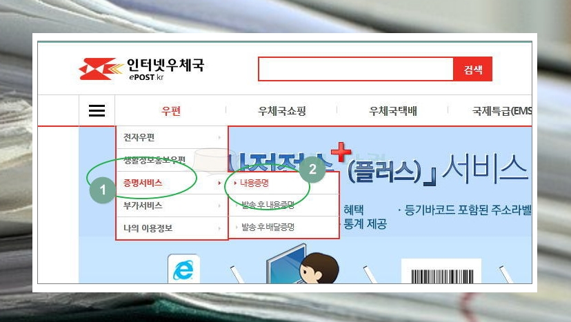 3) 메뉴에 있는 우편을 클릭한 후 증명서비스와 내용증명을 차례로 클릭해주세요.
