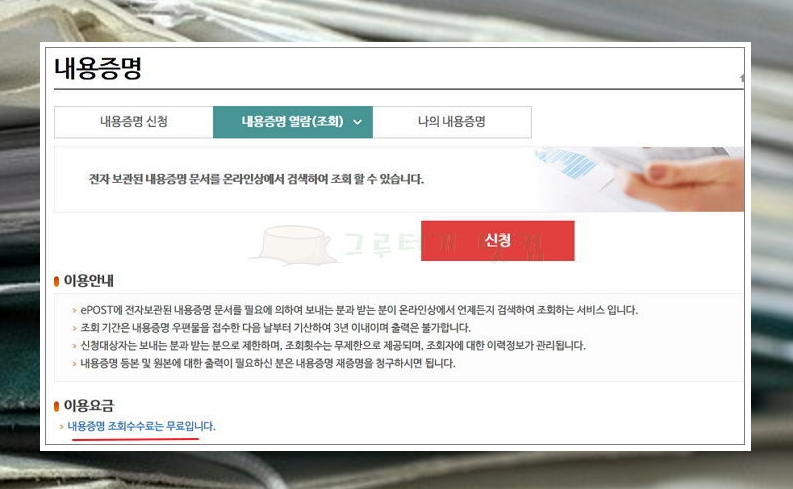 4) 내용증명 보내는 방법은 해당 페이지에서 신청을 누르면 됩니다.
