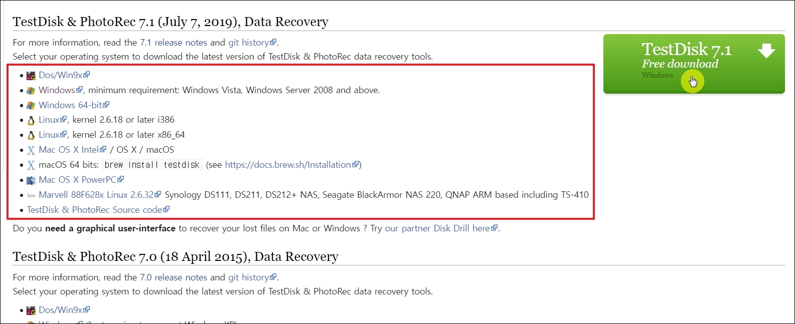 ▼다운로드 페이지가 열렸습니다. 여기서 휴지통에서 지운 파일 복구를 도와줄 프로그램을 다운 받도록 하겠습니다. [TestDisk Free download] 버튼을 클릭하면 됩니다. 참고로 이곳의 프로그램은 도스, 윈도우, 맥북, 리눅스 등에서 사용이 가능합니다.