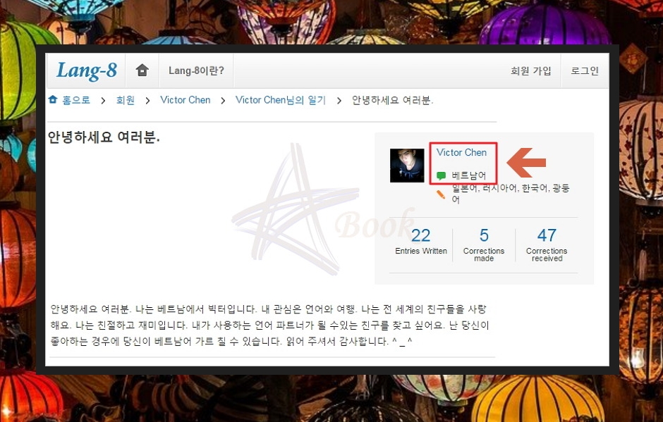앞서 추천해 드린 번역기들은 입력하면 즉시 결과를 볼 수 있는데요. 여유가 있으시다면 Lang-8을 사용해보시는 것도 좋습니다. 사람이(원어민) 직접 처리해 주기 때문에 수준 높은 결과를 얻을 수 있답니다. 거기다가 베트남어를 배울 수 있는 기회를 얻을 수도 있고요.