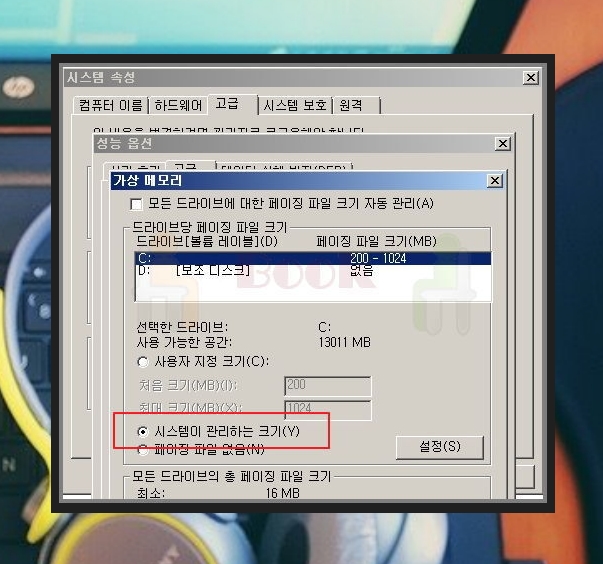 ▲ 가상 메모리 페이지에서 '모든 드라이브에 대한 페이징 파일 크기 자동 관리'에 체크가 되어 있다면 체크를 해제 해주세요. 그 다음 시스템이 관리하는 크기를 체크하면 됩니다.
