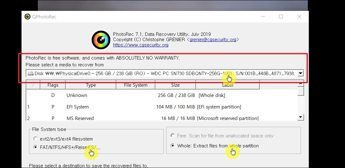 ▼본격적으로 프로그램을 이용하여 휴지통에서 지운 파일에 대한 복구 작업을 진행하도록 하겠습니다. 가장 먼저 파일을 지운 하드디스크를 선택합니다. USB 메모리나 외장하드, SDD, 휴대폰 메모리에서 지운 파일도 복구할 수 있습니다. 메모리 정보를 참고하여 File System type 영역에 있는 부분을 선택해 줍니다. 잘 모르겠으면 기본 셋팅으로 냅두어도 됩니다.