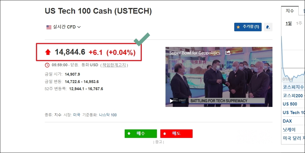 ▼어제 EWY는 마이너스 0.29% 하락했습니다. 하지만 폐장후 0.37% 상승한 것으로 보아 내일 증시가 보합이나 플러스 시작을 할 가능성이 높다고 보입니다. 여기에 더하여 인베스팅 홈페이지 우측에 있는 US Tech 100을 선택합니다. 미국 나스닥 선물지수인데, 해당 지수가 전 세계에 많은 영향을 줍니다. 우리 증시는 요즘 들어 해당 지표의 방향과 유사한 경향을 보이고 있습니다.