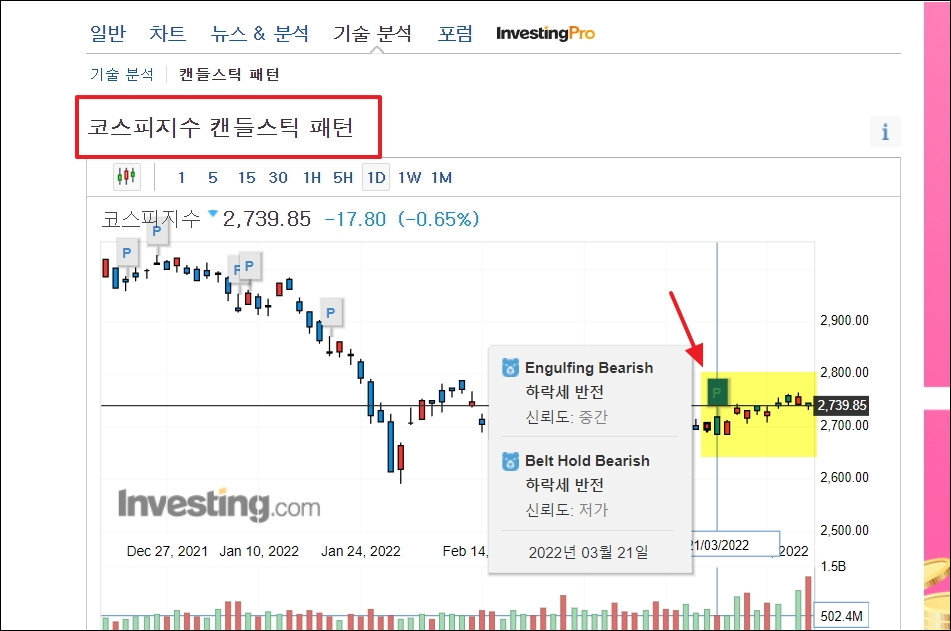 ▼코스피 지수에 대한 캔들스틱 패턴 분석도 이용할 수 있습니다. 최근에 하락세로 가는 캔들 패턴이 뜬 적이 있습니다. 하지만 그 다음날 상승했고, 조금씩 우상향하는 모습을 보이고 있죠. 이처럼 무조건 맞지는 않습니다. 하지만 참고는 할 만합니다.