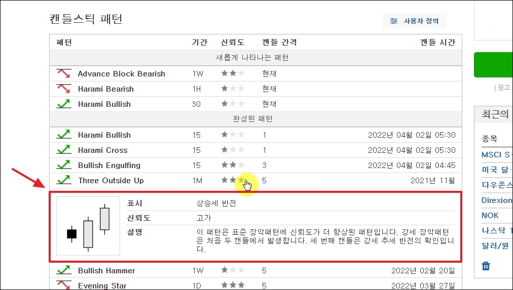 ▼메뉴에서 [캔들스틱 패턴]을 클릭하고, 그래프를 일봉으로 바꾸어 봅니다. 그럼 유의미한 캔들 패턴이 나왔을 때를 쉽게 파악할 수 있습니다. 무조건 맞는 것은 아니기 때문에 어느 정도 내일 증시 전망을 한 상태에서 근거를 찾아볼 때 사용하는 것이 좋습니다. 이러한 것이 맞으면 좋겠지만, 최근 들어 반대로 가는 경향이 있습니다. 이런 경향 속에서는 반대로 참고하는 것도 방법이 될 수 있겠죠.