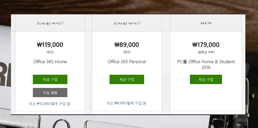 ▲ 이동한 페이지에서 보시면 오피스 365의 종류가 3가지 나타납니다.
