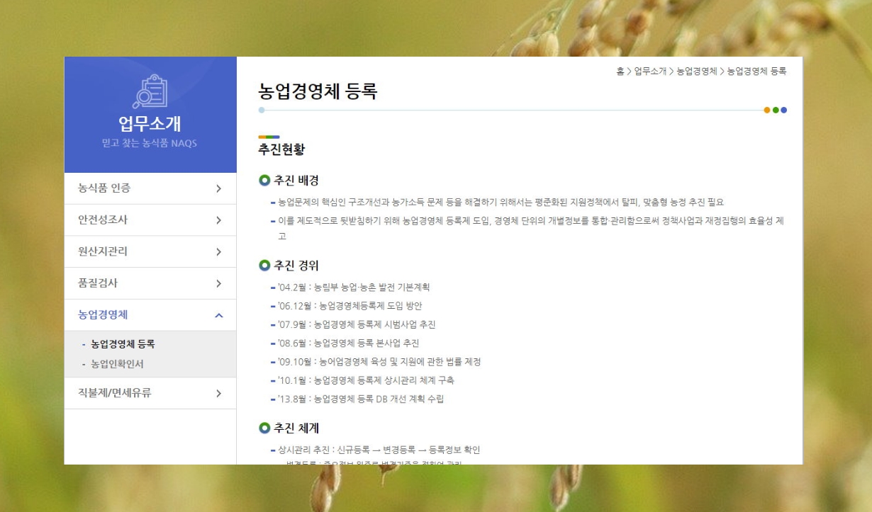 농업경영체 등록 관련 페이지가 열렸습니다. 이곳에서 신청서 양식을 다운 받거나 경영체 등록에 대한 상세한 안내를 받을 수 있어요.
