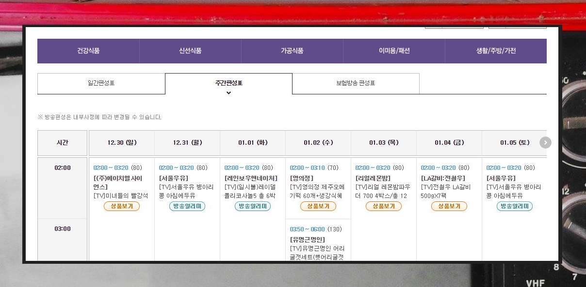 방송편성표 페이지에 가면 오늘 무슨 방송이 나오는지 알 수 있어요. '바로 구매' 버튼을 클릭하면 사이트 상에서 물건을 구매할 수 있는데요. 그 아래 보면 '방송 알림'이 있어요. 이것을 이용하면 다시보기 정말 편리해요. 다시 재방송을 해야 다시 볼 수 있는데요. 그 방송이 나오기 30분 전에 문자메시지를 통해 알려줘요. 다시보기 하고 싶은 제품 방송을 찾을 때에는 주간 방송편성표를 이용하는게 편해요.