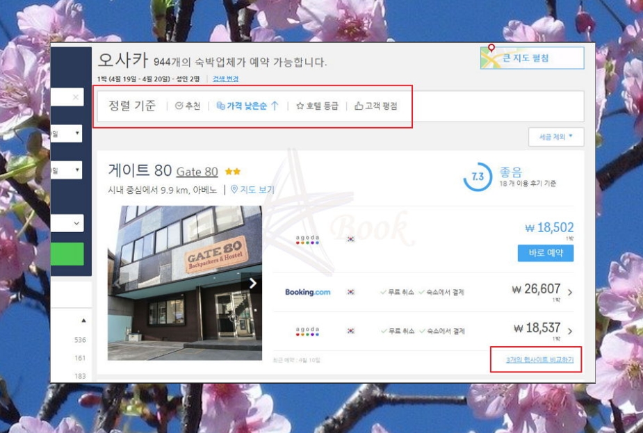 웹 사이트 비교하기를 클릭하시면 위에 이미지처럼 여러 일본호텔 가격들이 나오는데요.