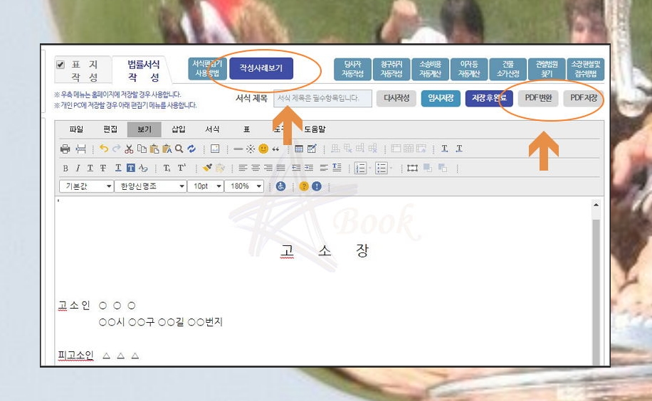 양식에 따라 빈 항목을 채워 넣는 식으로 작성하시면 되는데요. 그래도 고소장을 작성하는 것이 어려우시다면 사이트 상단에 [작성사례보기] 버튼을 눌러 보세요. 참고할 수 있는 사례를 확인하실 수 있어요.