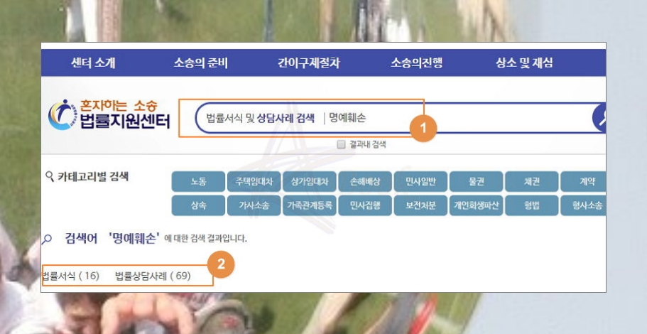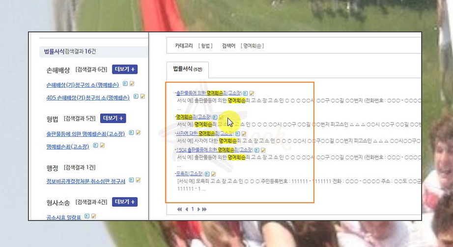 [법률서식 및 상담사례 검색창]에서 명예훼손을 입력한 후 엔터키를 눌러보세요. 관련 서식이 16건 나왔네요. 명예훼손 관련 상담사례도 69건이나 나왔어요. 궁금한 것이 있으면 상담사례를 통해 알아보는 것도 좋아요.