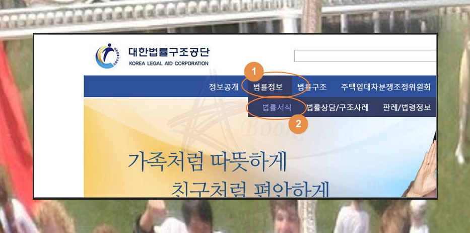 이곳에서는 법률구조는 물론이고, 다양한 상담 서비스를 제공하고 있는데요. 명예훼손에 대해 궁금한 것이 있으면 무료 상담 서비스를 통해 답변을 받으실 수 있어요. 무엇보다 양식을 따로 구할 필요 없이 해당 사이트에서 명예훼손 고소장을 작성할 수 있는데요. 메뉴에 있는 [법률정보]와 [법률서식]을 순서대로 클릭해 주세요.