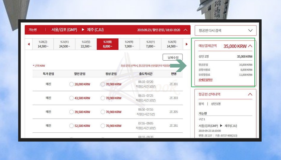 예약 사이트를 선택하게 되면 바로 예약 진행을 할 수 있는데요. 우리가 찾은 제주도 땡처리 항공권의 금액은 모든 비용을 포함한 가격입니다. 항공운임, 유류할증료, 공항사용료가 모두 포함되었다는 말인데요. 이 점을 참고하시어 예약을 하시길 바랍니다. 탑승 날짜와 시간 그리고 금액을 꼼꼼히 확인하시면 돼요.