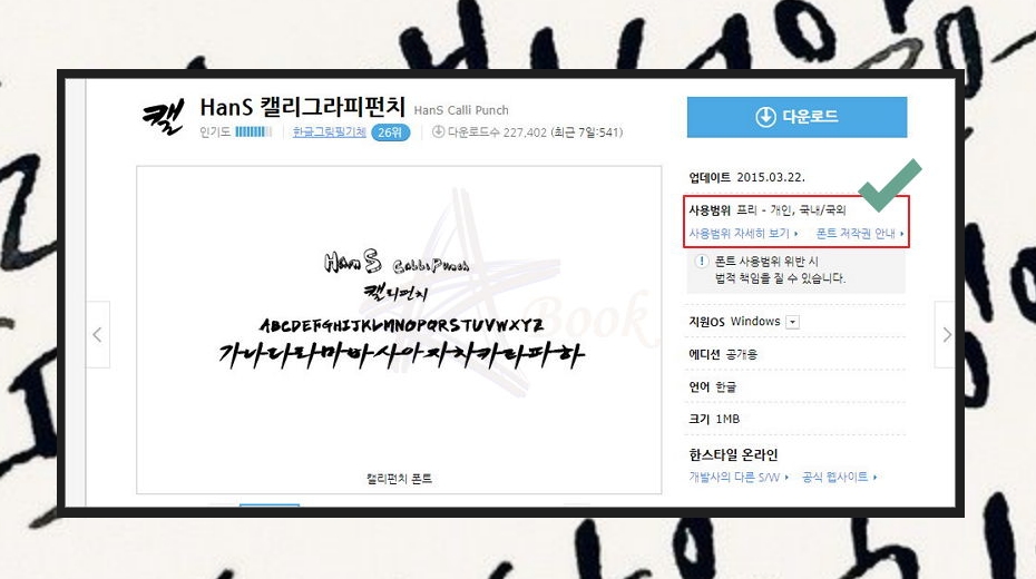 제가 이용하려고 하는 폰트는 HanS 캘리그라피 펀치 폰트에요. 높은 인기도를 자랑하는 폰트인데요. 사용 범위를 보면 알 수 있듯이 국내는 물론이고, 국외에서 개인용으로 마음껏 사용할 수 있어요. 지원하는 OS는 윈도우에요. 용량은 1MB 수준으로 크지 않으니 부담 없이 캘리그라피 글씨체 다운을 받아 보세요.