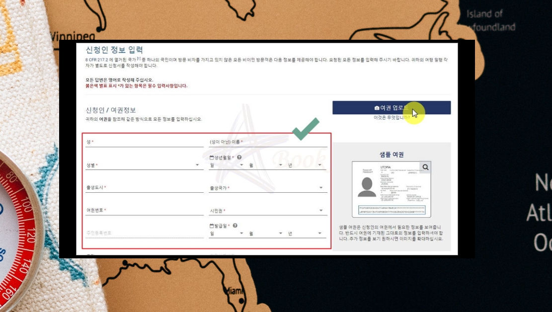 신청인 정보를 작성할 때에는 여권이 필요해요. 여권에 있는 내용을 참조해 성별, 생년월일, 출생도시, 출생국가, 여권번호, 시민권, 발급날짜 등을 채워 넣으면 돼요. 여권 이미지 파일을 업로드하는 부분도 있으니 참고해 주세요.