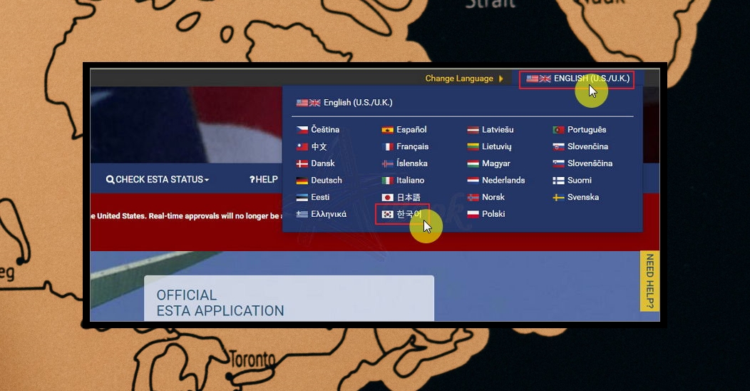 esta 전자여권 미국 비자를 신청하기에 앞서 사이트 언어를 변경하는 방법을 알려드릴게요. 영어에 능숙한 경우가 아니라면 화면 우측 상단에 있는 change language를 변경해 주세요. english를 클릭하면 여러 나라의 언어가 나타나는데요. 한국어를 클릭하면 돼요.
