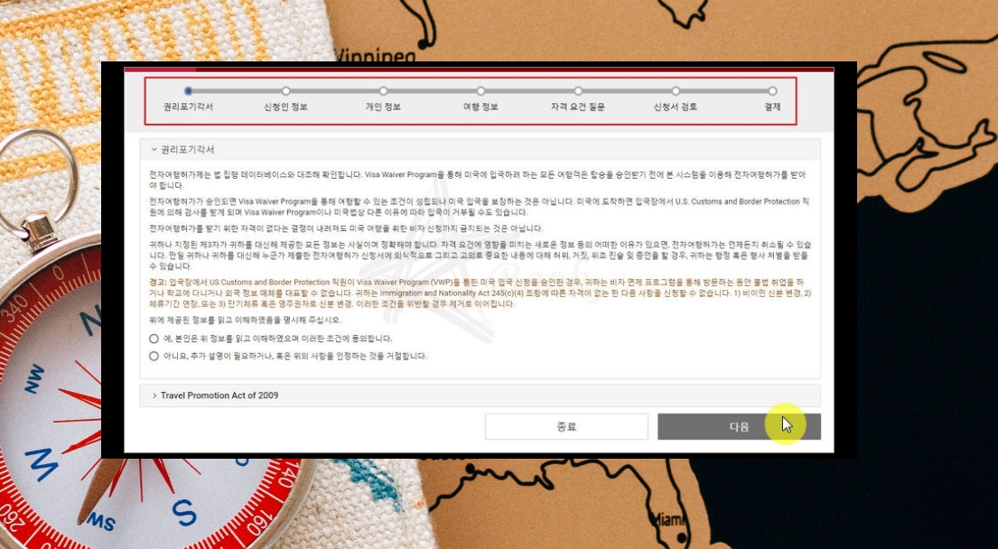 사이트에서 미국 esta를 신청하는 데에는 7단계의 과정을 거치게 돼요. 각서에 동의하기, 신청인 정보 작성, 개인 정보 입력, 여행 정보 입력, 자격 요건 질문에 대한 답변, 검토하기, 수수료 결제하기 이렇게 7단계 인데요. 안내가 상세하게 나와 있으니 꼼꼼히 읽어보시고, 안내에 따라 esta 전자여권 미국 비자를 진행하면 돼요.