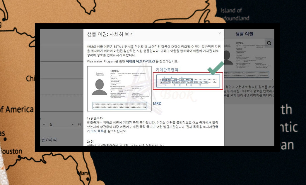 샘플 여권을 통해 여권을 참고하는 방법을 알아보실 수 있어요. 여권에서 어떤 부분을 참조하면 되는지 알 수 있어요. 기계판독영역을 보시면 각 부분에 대한 숫자가 표기되어 있는데요. 해당 부분이 어떤 정보를 담고 있는지 알아볼 수 있어요. 예를 들어 1번의 경우 발급 국가를 의미해요. 이렇게 상세한 안내가 나와 있으니 이에 따라 진행하시면 돼요.