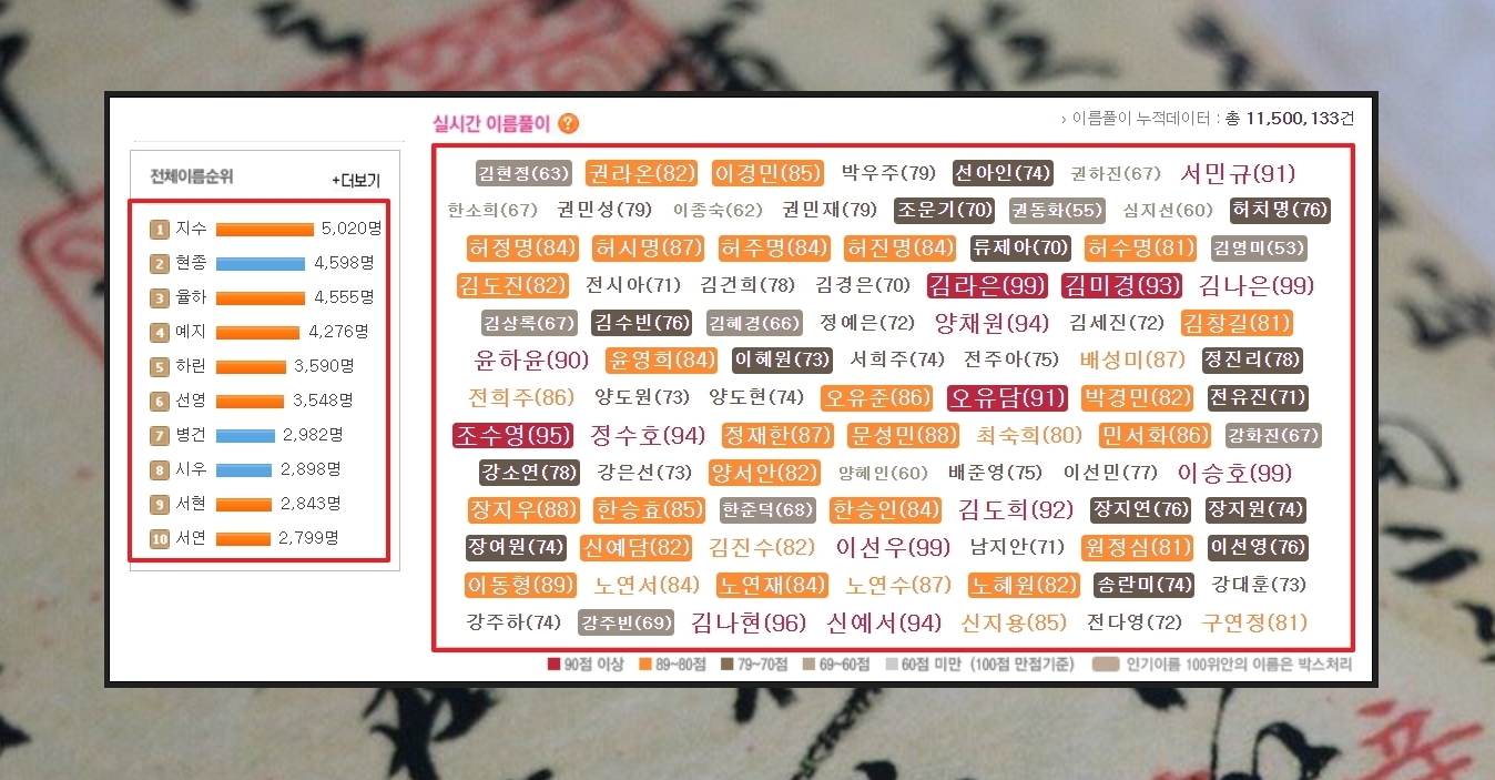 세상에는 예쁜 이름이 많습니다. 단순히 보기 좋거나 말하기 좋은 것보다는 좋은 한자까지 사용해야 금상첨화 입니다. 최근 선호도 순위를 살펴보면 지수, 현종, 율하, 예지, 하린 등이 있는데, 여기에 맞는 한자까지 추천 받을 수 있습니다.