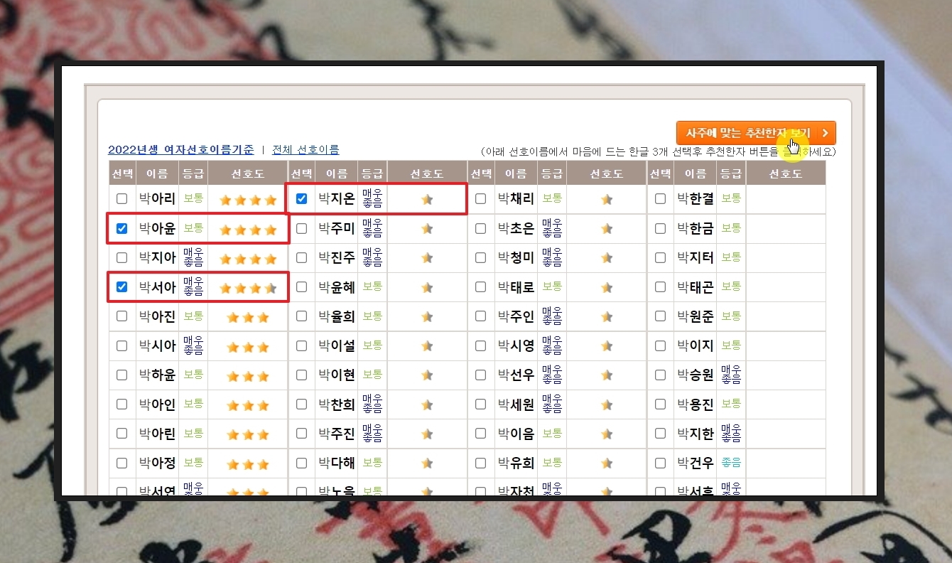 2022년 기준으로 선호도 순위를 확인해 보겠습니다. 개인적으로 예쁜 편에 속하는 것으로는 박아윤, 박서아, 박지은 입니다. 사람마다 마음에 드는 것이 다르기 때문에 본인 마음에 드는 것을 선택하면 됩니다. 여기서 3가지 성명을 선택한 후 [사주에 맞는 추천한자 보기] 버튼을 클릭해 봅니다.