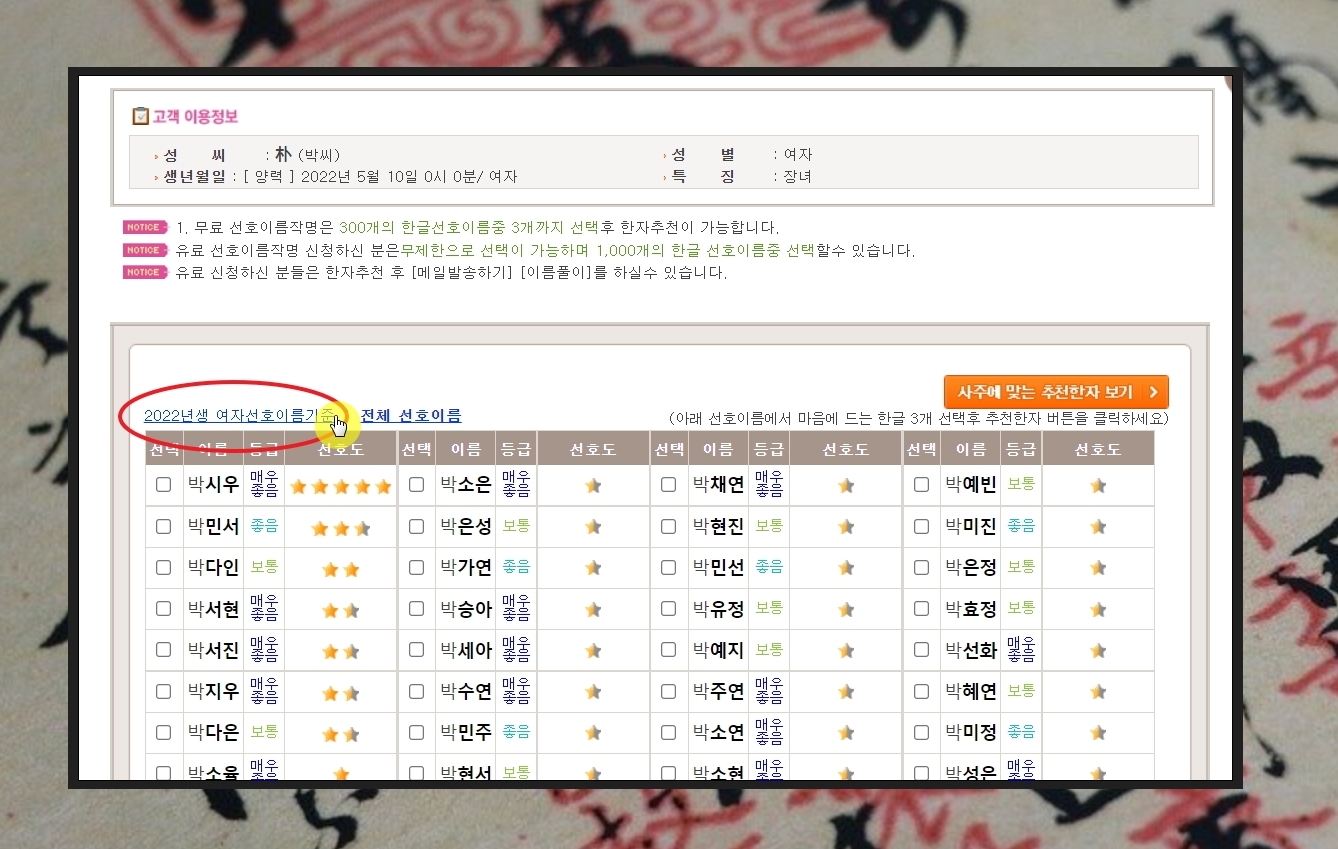 몇 가지 정보를 입력한 후에 [무료작명 시작] 버튼을 클릭해 보았습니다. 이에 따라 예쁜 이름 300개로 구성된 표를 볼 수 있는 페이지가 열렸습니다. 가장 예쁜 것을 찾으려면 선호도 점수가 높은 것 위주로 살펴보면 됩니다. [2022년생 여자선호이름기준] 버튼을 클릭하면 올해에 좋은 것 위주로 300개 한글 성명이 나타납니다.