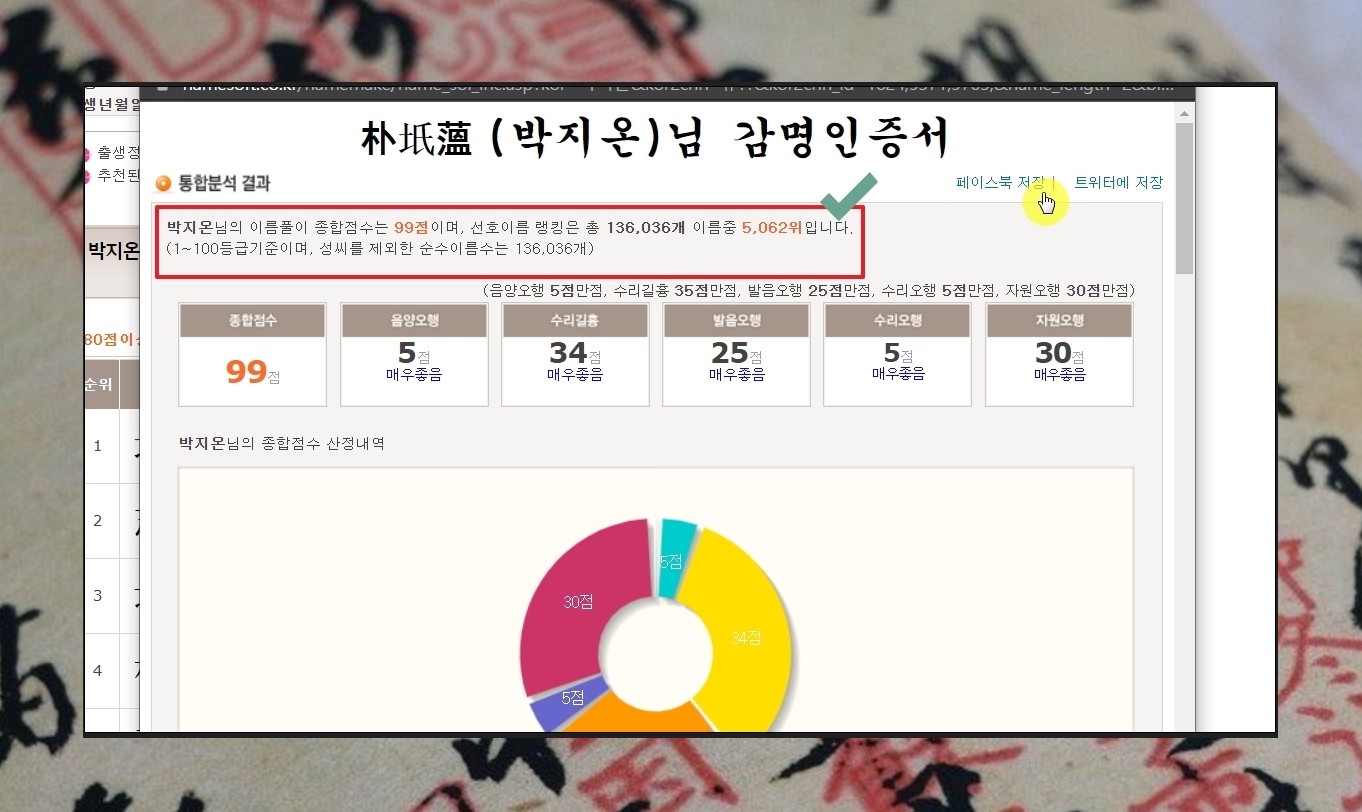 [풀이] 버튼을 누르면 다음과 같음 감명인증서가 나타납니다. 페이스북이나 트위터에 저장이 가능하고, 종합점수와 랭킹 확인이 가능합니다. 그래프를 통해 종합점수 산정내역도 볼 수 있어서 쉽게 파악이 가능합니다.