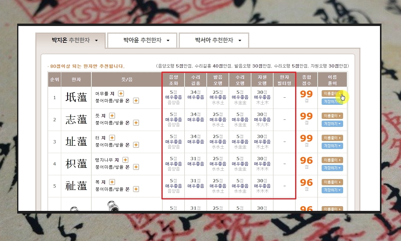 예쁜 이름에 맞는 한자를 추천하는 페이지가 열렸습니다. 단순히 뜻이 좋은 한자를 추천하는 것이 아니라 성명학 이론에 속하는 음양조화, 발음오행, 수리오행, 자원오행, 수리길흉을 따진 것입니다. 종합점수가 99점이나 될 정도로 매우 좋은 성명을 찾았습니다. 마음에 드는 것이 있으면 [풀이] 버튼을 클릭해 봅니다.