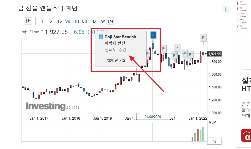 ▼메뉴에서 [캔들스틱 패턴]을 클릭해 봅니다. 그럼 자동으로 패턴을 찾을 수 있는 차트가 나타납니다. 기본 차트에 [P]라는 문자 아이콘이 보일 겁니다. 여기에 마우스 커서를 올려봅니다. 그럼 상승세인지 하락세인지 알려줍니다. 신뢰도 표시도 되어 있기 때문에 신뢰도를 참고하여 캔들의 유의미함을 판단하면 됩니다. 물론 신뢰도가 높다고 해서 100퍼센트 맞는 것은 아닙니다. 국제 금시세 전망을 함에 있어서 수 많은 근거 중 하나로 보는 것이 안전합니다.