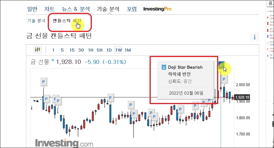 ▼방금 본 캔들스틱 패턴 차트는 인베스팅 사이트에서 이용할 수 있습니다. 여기는 많은 사람들이 주식 정보를 얻을 때 많이 이용하는 곳인데, 주식 관련 정보 외에도 외환, 원자재, 채권 등 다양한 상품에 대한 정보를 다루고 있는 곳입니다.