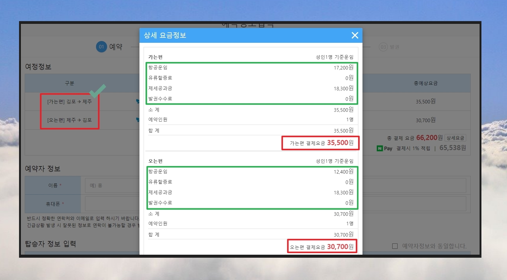 제가 선택한 업체의 예매 사이트가 열렸습니다. 화면에 나타난 티켓 정보를 꼼꼼히 확인해 봅니다. 그 후 안내에 따라 예약자 정보를 입력하고, 저가항공권 금액을 결제하면 됩니다.