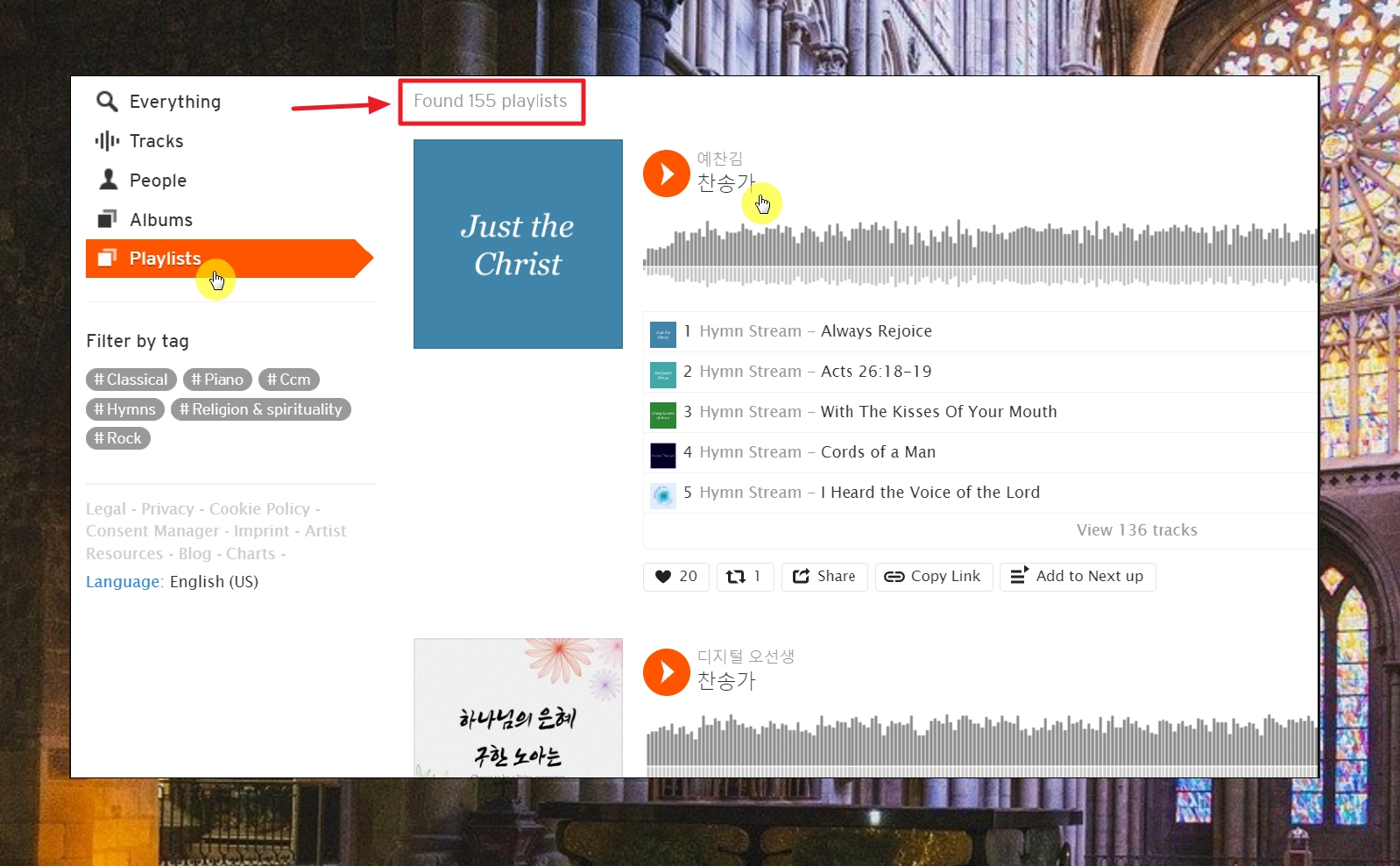 좌측에 있는 메뉴에서 "Playlists"를 선택하면 찬송가 모음집을 찾을 수 있습니다.