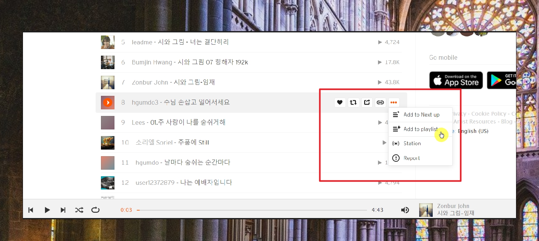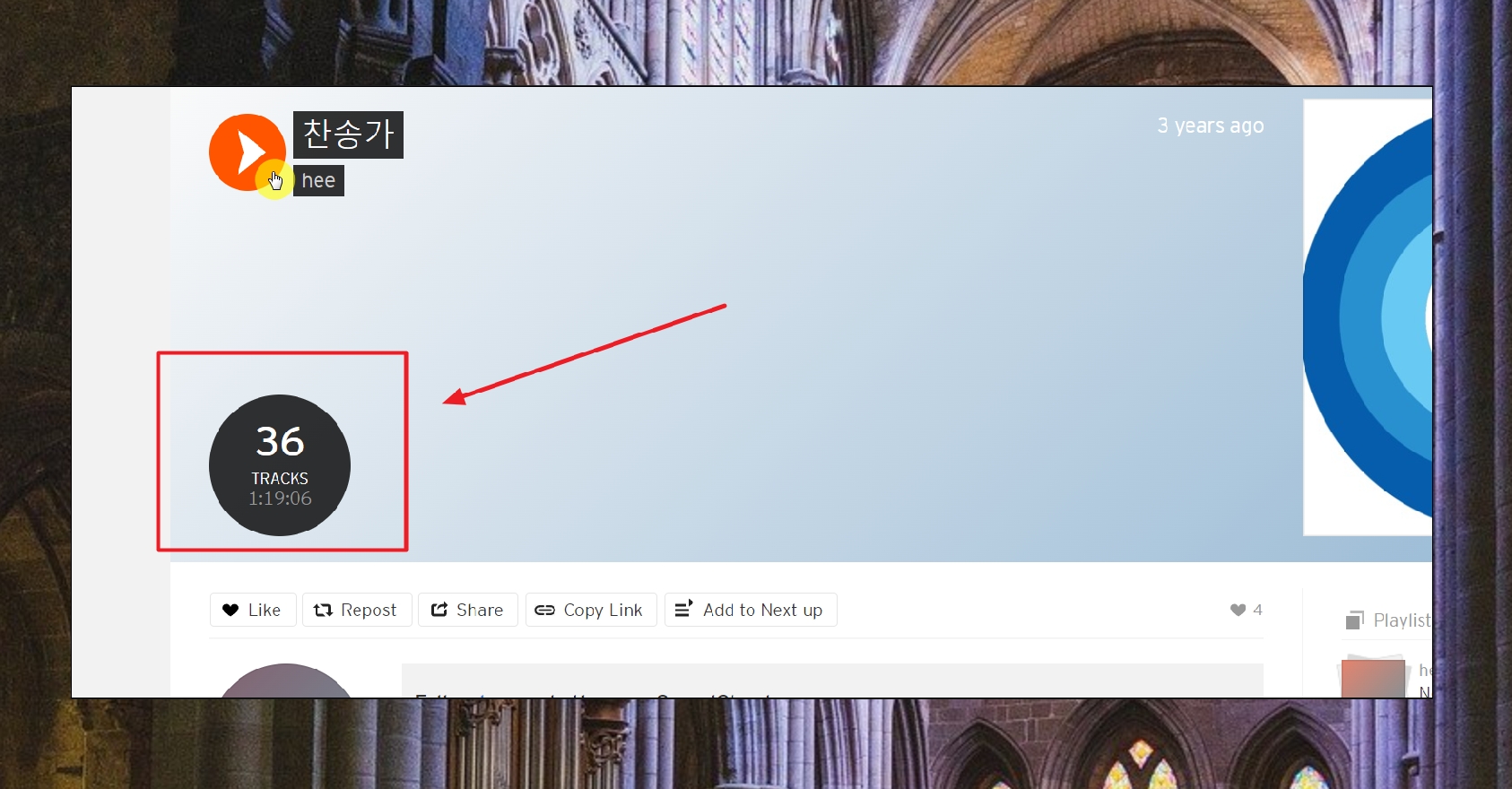 우측에 보면 여러 가지 곡 이름이나 플레이리스트가 나타나는데요.