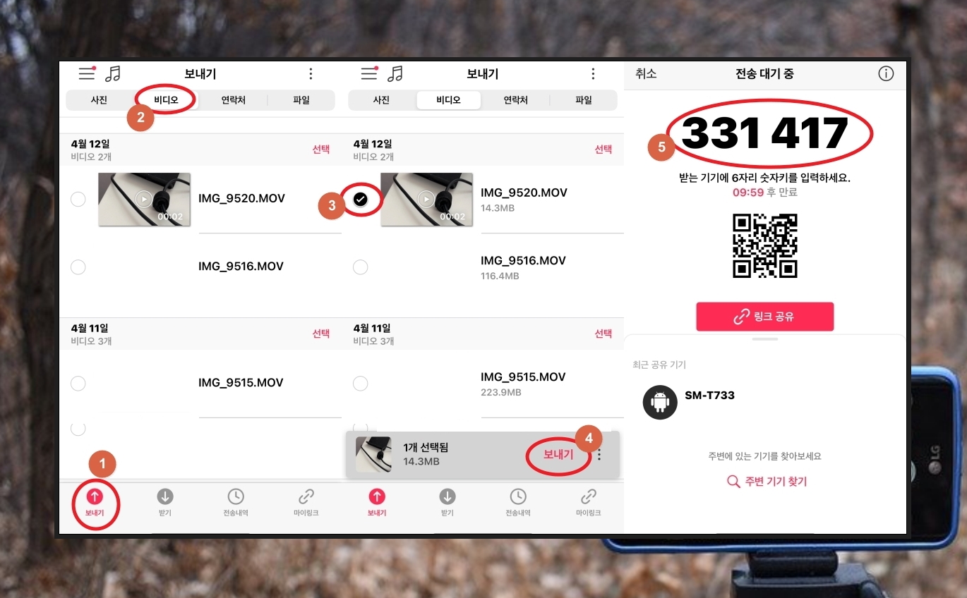 샌드애니웨어 앱을 설치하면 다음과 같이 앱을 실행해 보세요. 그다음 화면에서 좌측 하단에 있는 [보내기] 버튼을 클릭합니다. 그럼 사진, 비디오, 연락처, 파일 이렇게 4가지로 나누어 아이폰에 들어 있는 데이터를 컴퓨터로 옮기기 가능합니다. 동영상을 옮기고 싶은 경우에는 비디오 메뉴를 선택한 후, 보내고 싶은 동영상을 선택해 주세요. 동영상을 선택하면 앱 화면 하단에 [보내기] 버튼이 추가로 나타나는데요. 해당 버튼을 눌러보세요. 그럼 6자리 숫자를 얻을 수 있어요. 이제 이 숫자를 받는 기기에 입력하면 돼요.
