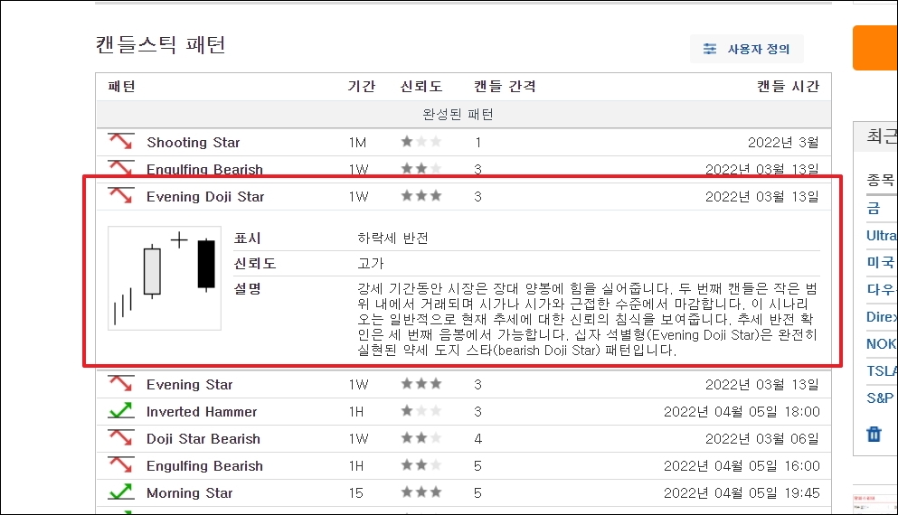 ▼차트 아래에는 여러 캔들스틱 패턴에 대한 표가 나옵니다. 각 신호에 대한 기간, 신뢰도, 캔들 가격, 캔들 시간이 나옵니다. 클릭해보면 자세한 설명을 볼 수 있습니다. 금시세 전망과 더불어 캔들 공부에도 도움이 됩니다.
