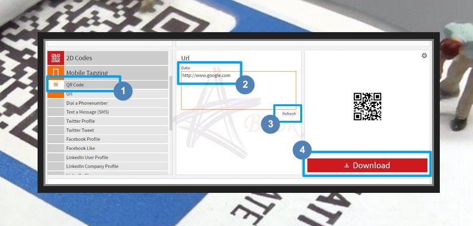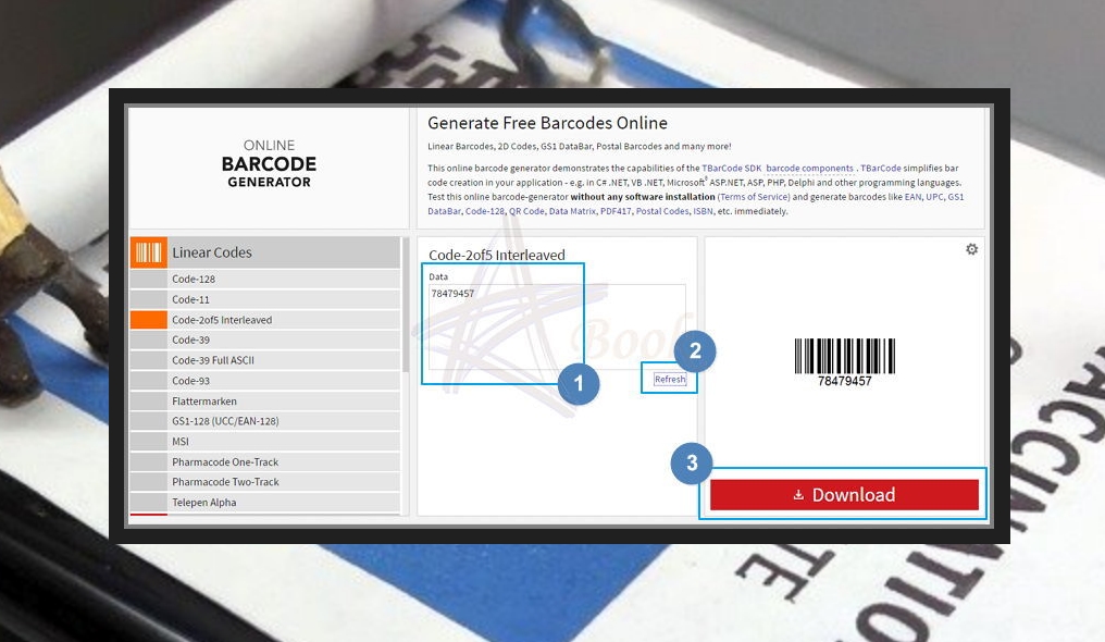 제가 표시해 놓은 번호에 따라 순서대로 입력하고 클릭하시면 되는데요. ① 바코드 생성기에 내용을 입력하고, ② Refresh를 누르면 ③ 자동으로 생성됩니다. (만들기 쉽죠?) 마지막으로 'Download' 버튼을 누르면 이미지 파일로 내려받을 수 있습니다.