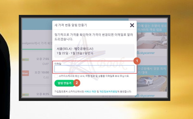 스카이스캐너를 사용하다 보면 '새 가격 변동 알림 만들기' 창이 뜨는데요. 여기에 이메일 주소를 입력하면 오늘 찾은 제주도 비행기표 가격보다 저렴한 항공권이 나타났을 때 알려준답니다. 비교해보고 당장 예매하지 않을 때 사용하면 좋아요.