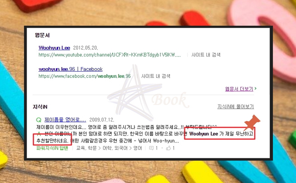 2단계에서 영어이름을 클릭하면 위와 같이 인터넷에서 검색된 내용들이 나오는데요. 해당 성명을 사용한 홈페이지를 통해 어떤 식으로 사용하고 있는지 알 수 있습니다. 지식인에서도 Hyun을 사용하는 것이 좋다고 하네요. 해외에서 자주 활동하는 유명인의 성명과 똑같은지 비교해보는 것도 좋은 방법입니다.