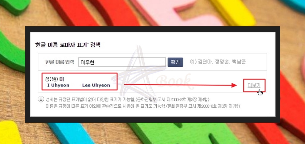 예를 들어 이우현이라는 사람의 성명을 검색해보겠습니다. 성을 I로 쓸지 Lee로 사용할지는 이견이 없지만, 뒤에 들어가는 현은 Hyun으로 쓰는 사람도 있고, Hyeon을 사용하는 사람도 있는데요. 두가지 모드 영어이름 표기법을 준수한 것이기 때문에 사람의 판단이 필요합니다. '더보기'를 눌러보세요.