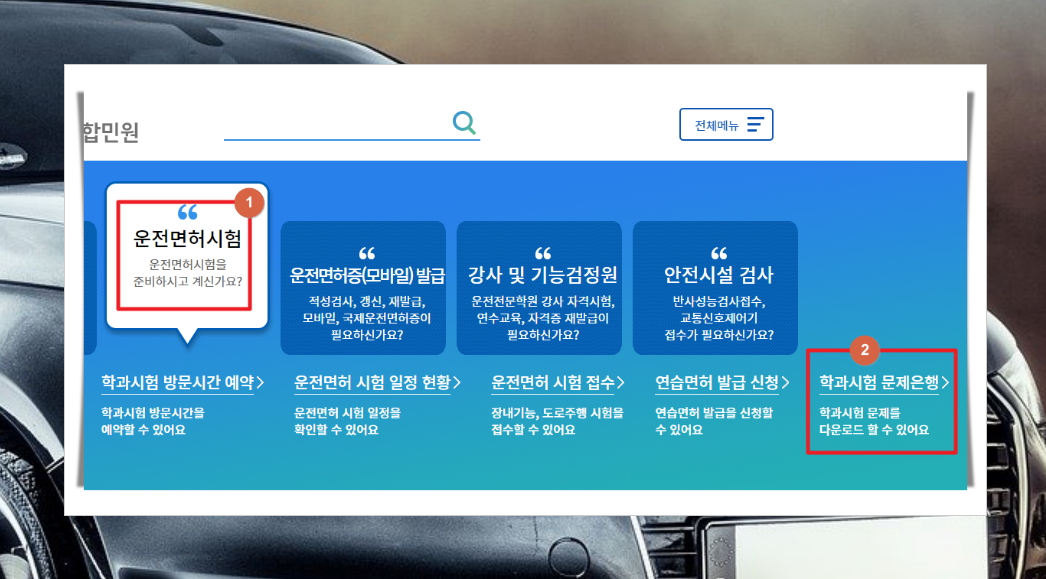 안전운전 통합민원 홈페이지에 접속하면 여러 가지 메뉴가 나타납니다. 여기에서 자동차 운전면허시험 메뉴를 선택해 보세요. 그럼 다음과 같은 메뉴를 통해 여러 가지 서비스를 이용할 수 있습니다.