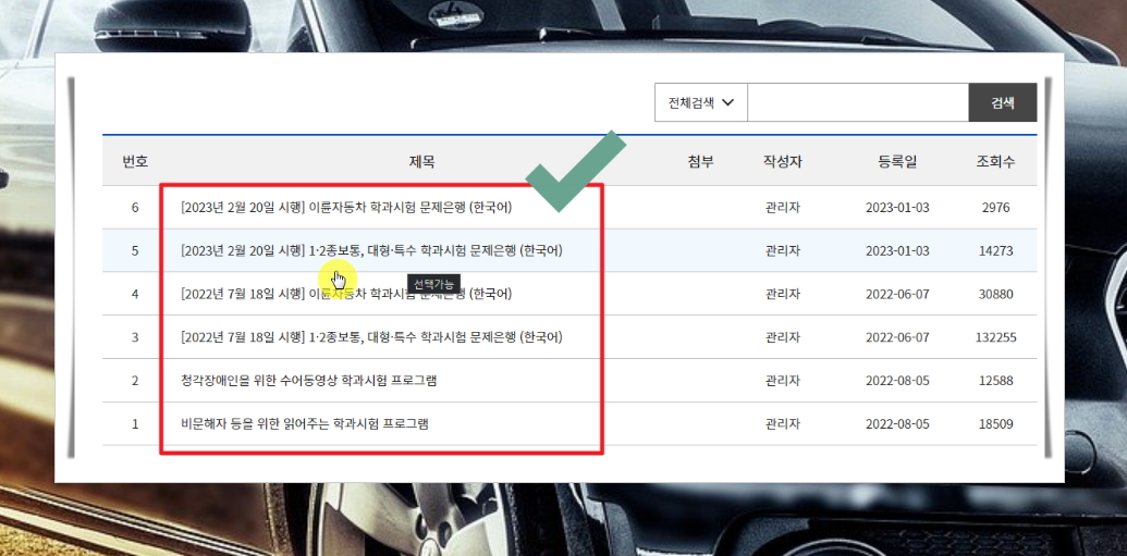 자동차 운전면허 필기시험을 보게 되는 날을 기준으로 이용해야 하는 문제가 달라질 수 있습니다. 2023년 2월 20일 이전에 시험을 치르게 되는 분들은 3번과 4번 자료를 이용해야 해요. 2023년 2월 20일 이후에 시행되는 필기시험에 응하는 분들은 5번과 6번을 이용하면 됩니다. 대부분 1종 또는 2종 보통에 해당하는 자동차 운전면허를 취득하기 때문에 3번과 5번 사이에서 선택을 하면 되고요.