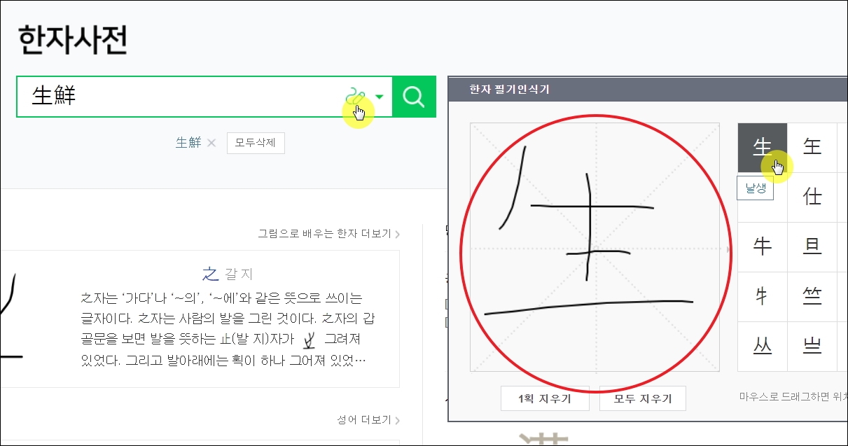 ▼변환기에 한문으로 입력하는 것이 번거롭다면 필기인식기를 사용해 보면 좋습니다. 검색 버튼 바로 옆에 위치한 [필기] 아이콘을 클릭하면 사용할 수 있습니다. 마우스로 한자의 모양을 그리기만 하면 되기 때문에 정말 편리합니다.