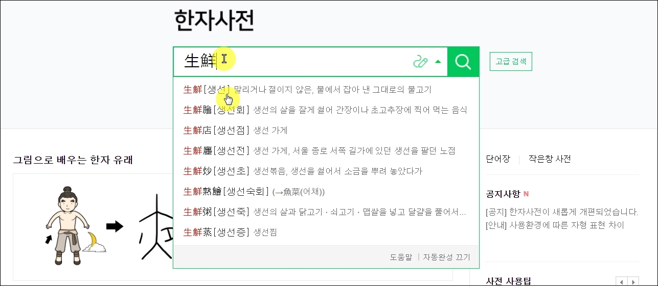▼네이버 한자 사전 사이트에 접속했습니다. 검색창에 한글로 된 단어를 입력하면 해당 단어에 맞는 한자는 물론이고, 관련 있는 문자와 고사성어를 모두 찾아볼 수 있습니다.
