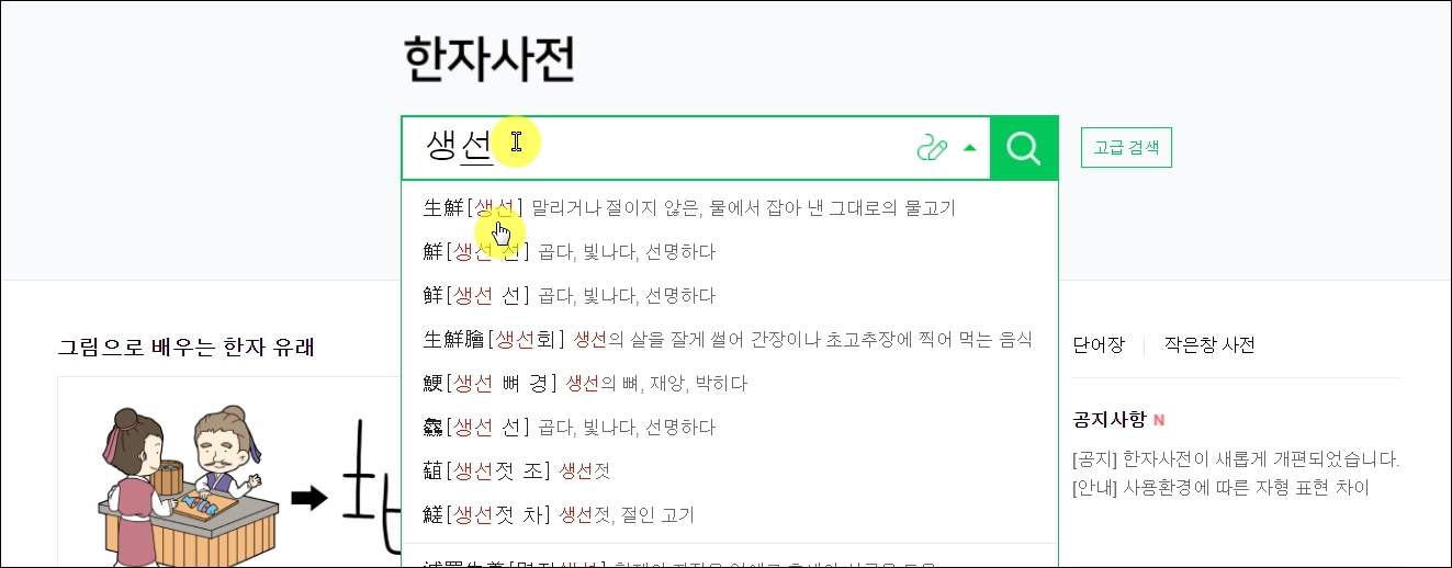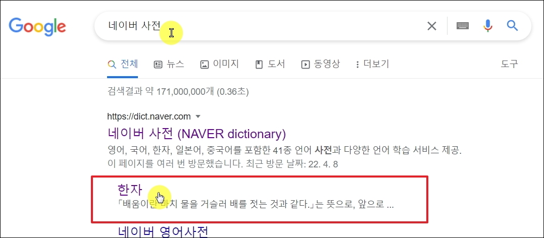 ▼반대로 한자를 네이버 사전에 입력하면 다음과 같이 한글로 된 문자를 얻을 수 있습니다.