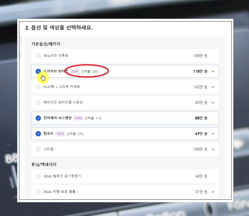 정확한 최종 구매 비용을 산출하기 위해서는 4단계로 선택을 진행하면 되는데요. 가장 먼저 세부모델을 선택해야 합니다. 어떤 것이 가장 인기가 있는지 선호도(TOP) 표시가 되어 있습니다. 정해 놓은 것이 따로 없다면 "TOP1"을 선택해 주세요.