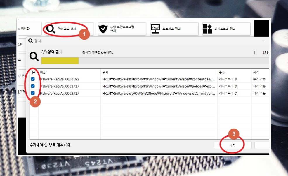 이번에는 악성코드 검사를 해보겠습니다. 자동으로 여러 가지 검사를 진행하는데요. 결과를 통해 수리해야 하는 항목의 정보를 확인할 수 있습니다. 우측 하단에 있는 [수리] 버튼을 누르면 간단히 해결됩니다.